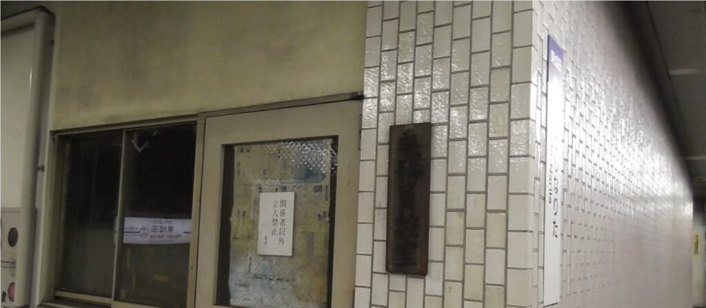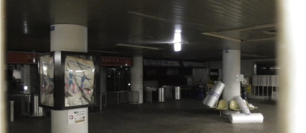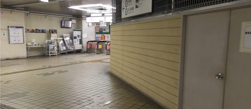 無駄に広い空間を仕切りで仕切っているので、気になって覗いてみると昔の改札跡が見えますね。