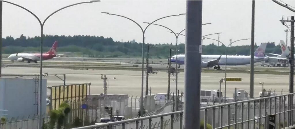 ホームに降りると、成田空港に止まる飛行機がよく見えますね~