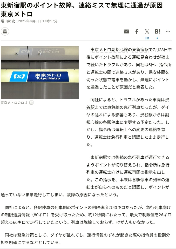 東新宿駅のポイント故障、連絡ミスで無理に通過が原因 東京メトロ:朝日新聞東京メトロ副都心線の東新宿駅で7月28日午後にポイント故障による運転見合わせが夜まで続いたトラブルがあり、同社は6日、指令所と運転士の間で連絡ミスがあり、保安装置を切った状態で電車を動かし、無理にポ…