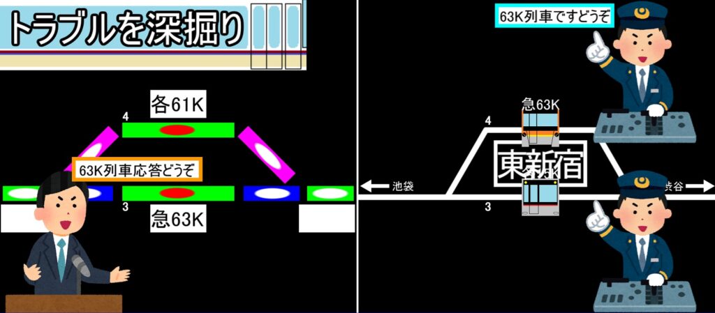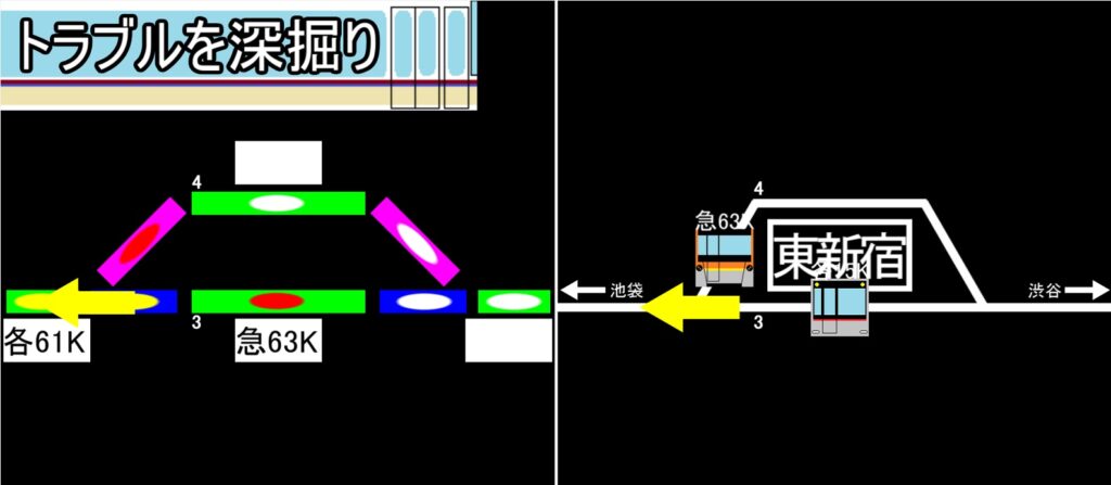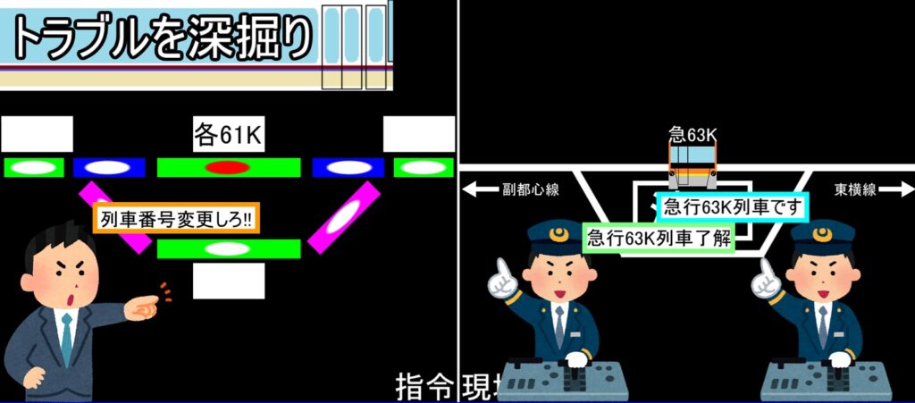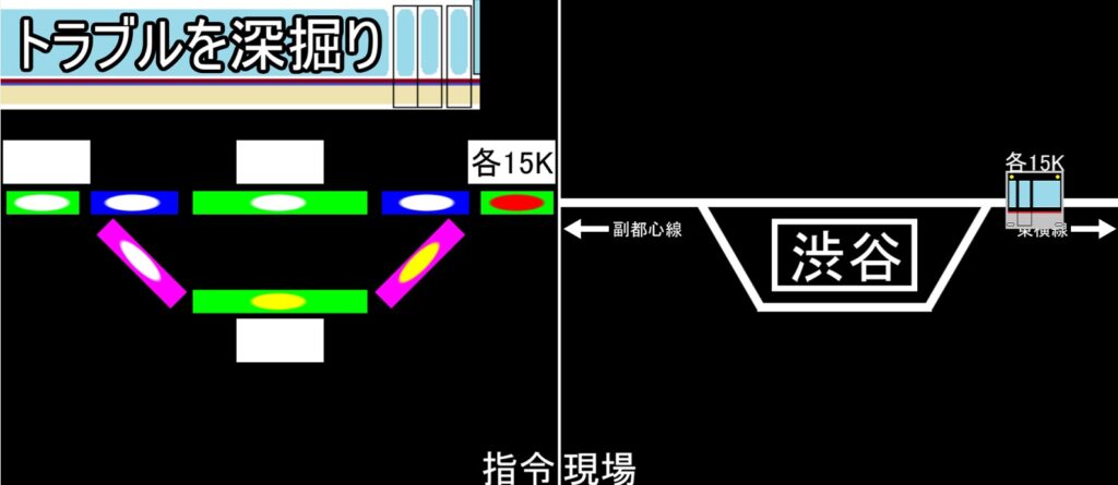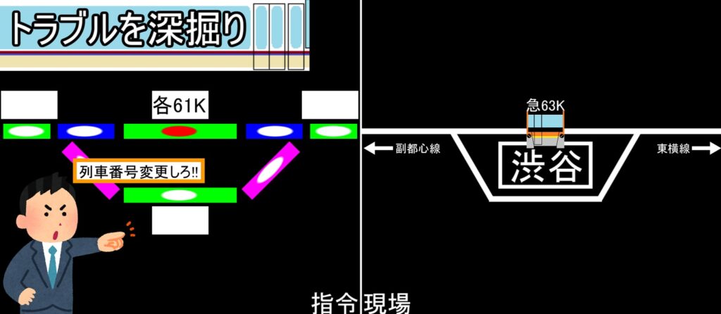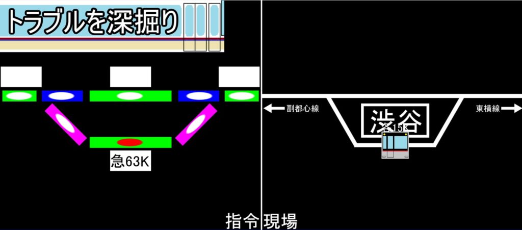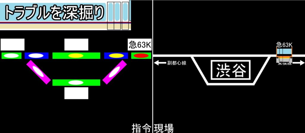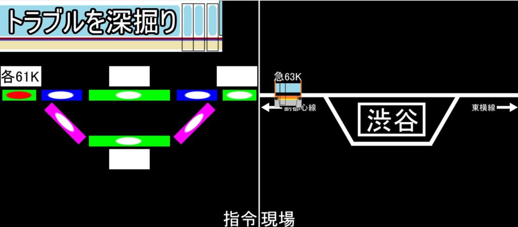 その後、渋谷駅には各停の15K列車が到着するわけですが、この電車はここから急行63K列車として指令は手配しましたが、再び運転士には伝わらず渋谷駅を発車することになります。