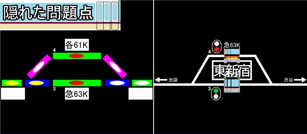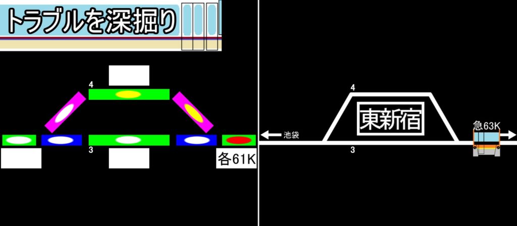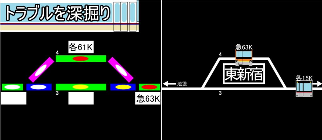 東新宿駅を出発させるとき、当然3番線からの電車を出すために4番線の電車は赤信号で進むことができません。