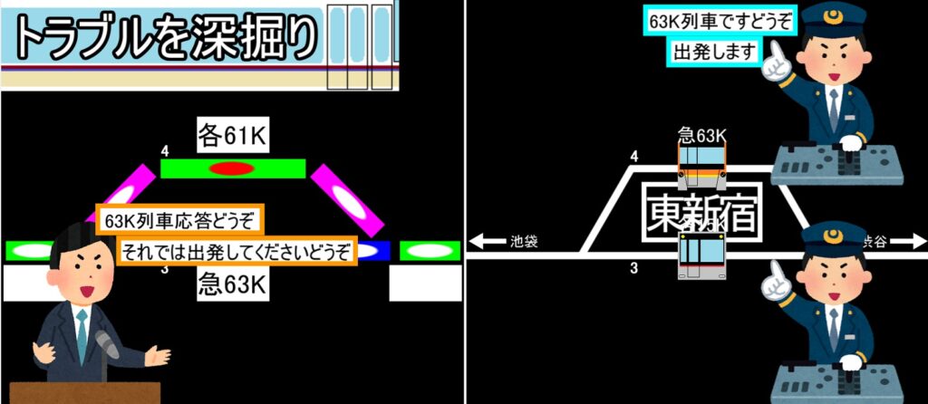 指令は3番線に止まっている電車に対して出発するように指示していましたが、4番線に停止している電車の運転士が自身の電車に対して指示されているものと誤認して東新宿駅を発車させました。