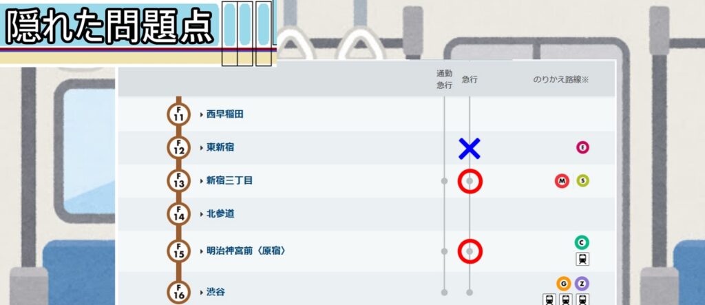 勘の言い方はすでにお気付きだと思いますが、急行電車は本来東新宿駅には停車しません。